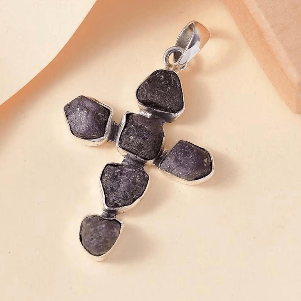 This artisan crafted silver pendant features a rough-cut gemstone, showcasing its natural texture and charm. Handcrafted in sterling silver, the cross pendant highlights the organic beauty of the stone. It offers a simple yet striking addition to any jewelry collection.