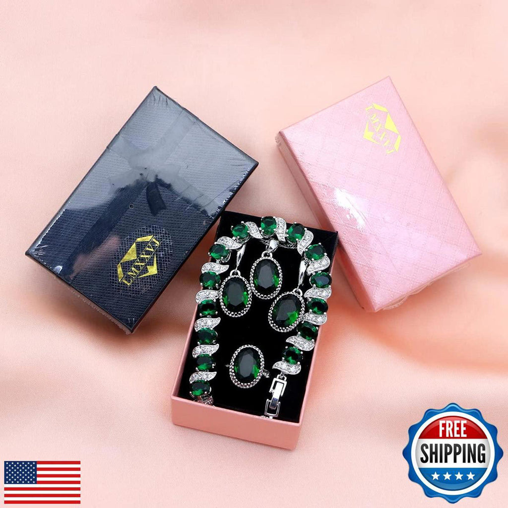 Jewelry Set list:A chain pendant, a tennis bracelet, a pair of drop earrings and an eternity ring All parts are inlaid with 10*12 mm created green emerald ,Platinum plated/silver -tone Highly polished. Nickel-free, hypoallergenic, always shining. Our jewelry is suitable for almost all sensitive ears. A perfect box gift will be sent together