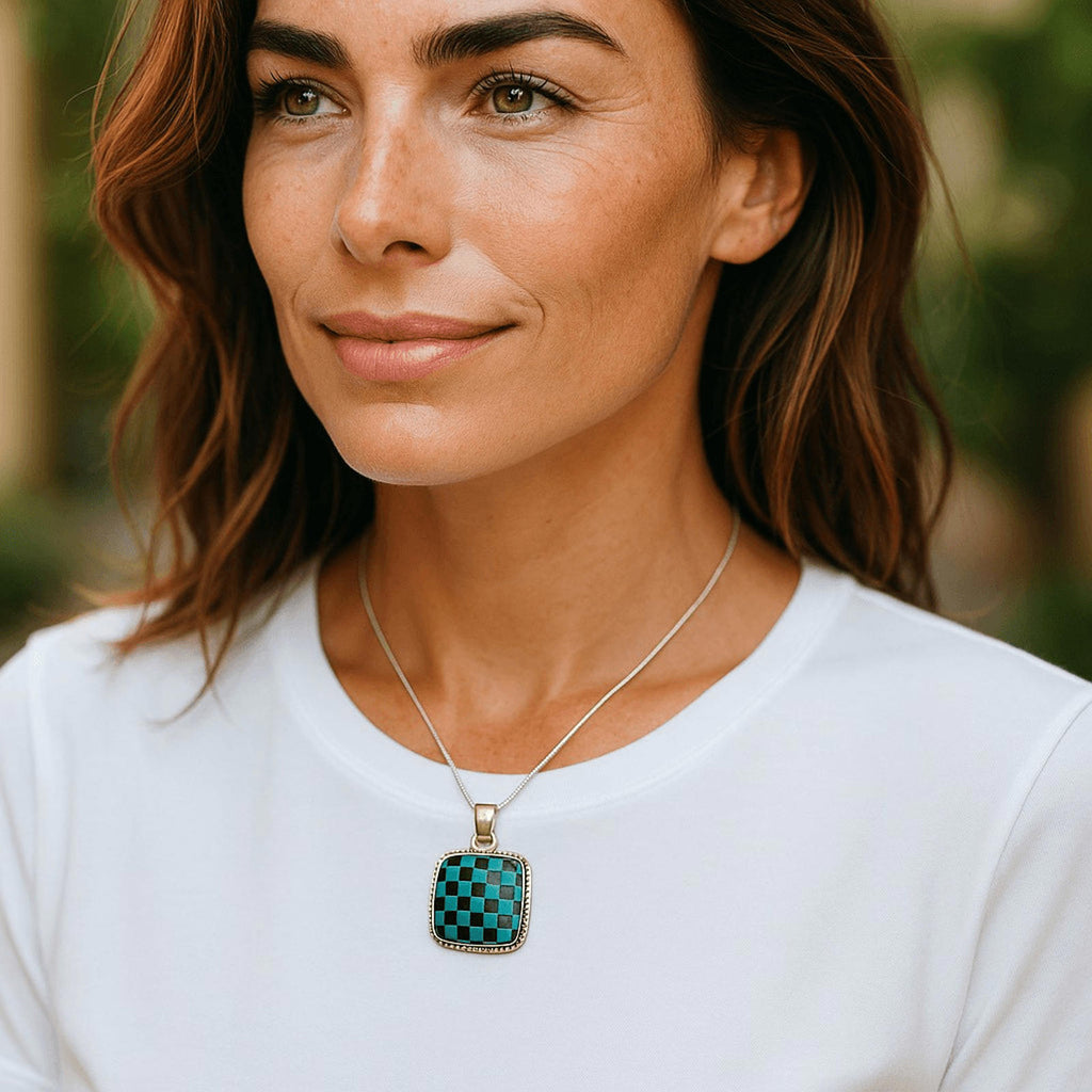 Elevate your style with the Trendy Southwest Kingman Turquoise and Onyx Checker Sterling Silver 20” Necklace. This exquisite piece features a stunning checkerboard pattern of genuine Kingman turquoise and onyx stones, set in high-quality sterling silver. The vibrant turquoise contrasts beautifully with the deep black onyx, creating a striking and unique design.