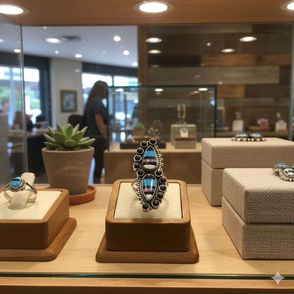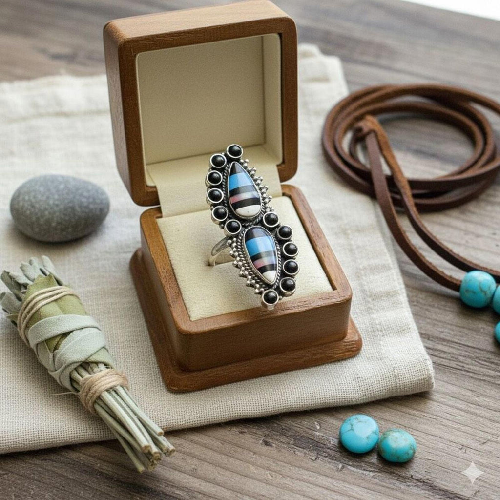 Make a bold statement! This gorgeous ring features a striking dual inlay of genuine Aurora Opal set in detailed Sterling Silver. Its long, elegant silhouette is inspired by traditional Southwestern designs, offering a dramatic look that's perfect for everyday wear or a special occasion. Best of all, the band is adjustable, allowing you to find your perfect fit easily.