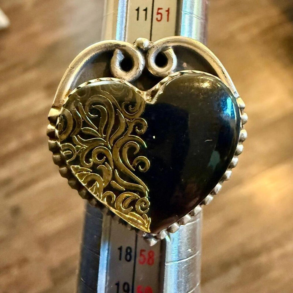 Add a touch of desert soul to your style with this striking Southwestern Onyx Heart Ring. Featuring a bold black onyx stone carved into a heart and set in a rustic, boho-inspired frame, this piece blends elegance with earthy charm.