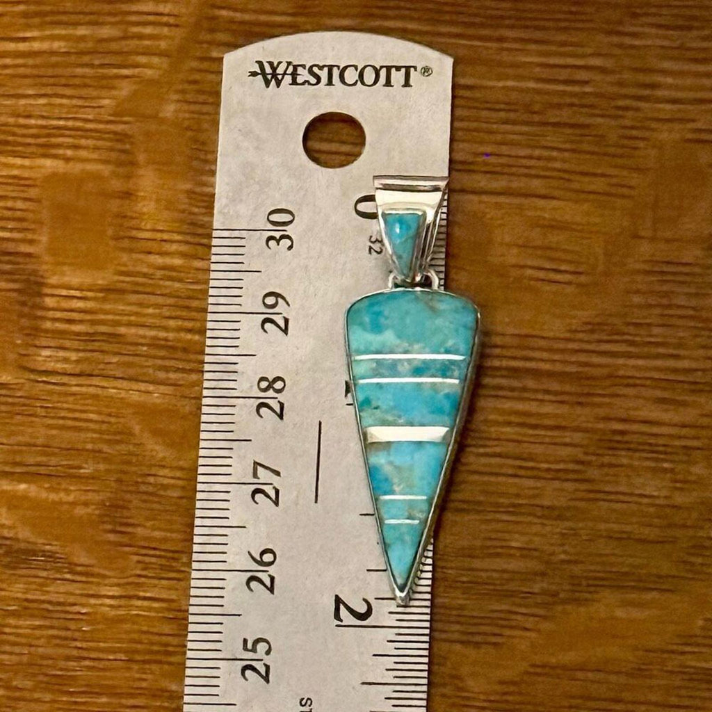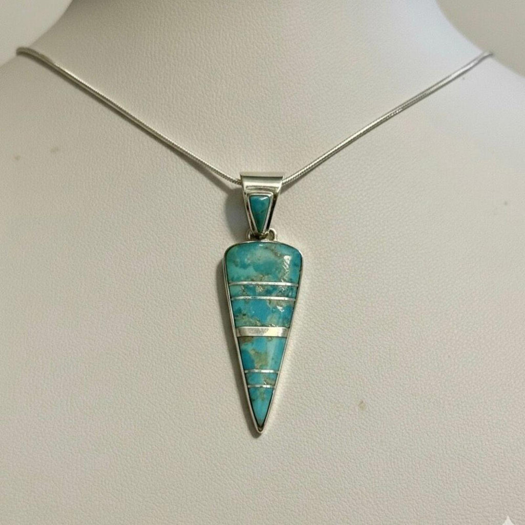Add a touch of Southwestern elegance to your collection with this stunning Turquoise Inlay Pendant. Featuring a sleek, elongated triangular silhouette, this piece showcases beautiful natural turquoise stones separated by delicate silver channels. The vibrant blue and green hues of the turquoise make it a versatile statement piece for any occasion.